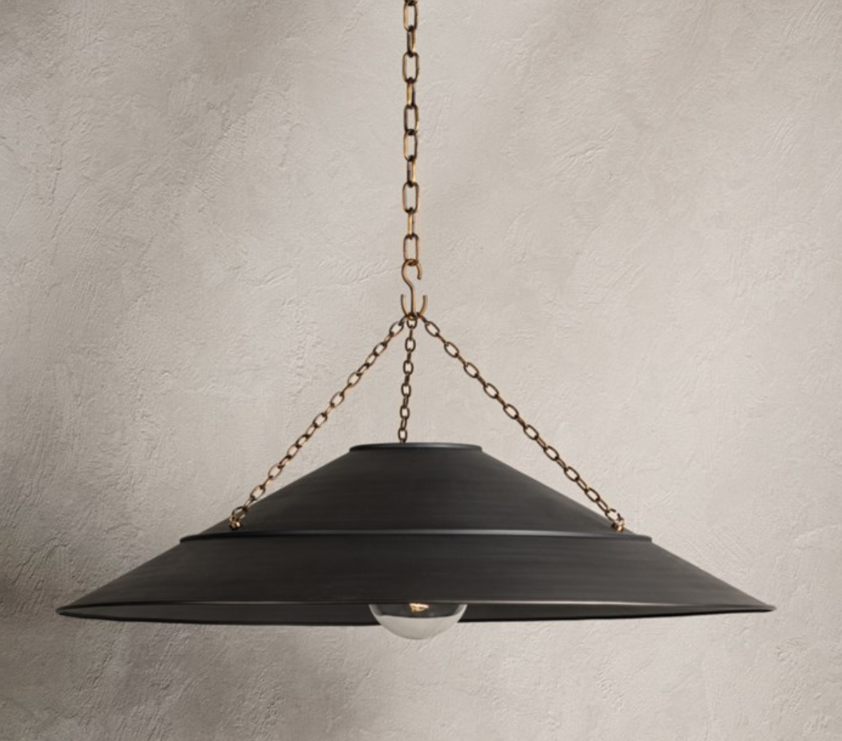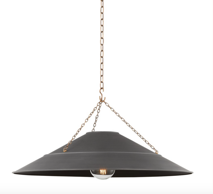 The Arcane Pendant showcases an elevated industrial vibe, featuring exposed metalwork, chain detailing, and a unique combination of finishes. The chic graphite shade provides a warm and inviting glow, while the Patina Brass hardware, chain, and canopy introduce a subtle shine that beautifully contrasts with the graphite. The twisted black fabric cord adds a vintage-inspired detail, enhancing the pendant's overall retro feel. Part of our Lauren Liess collection, the Arcane Pendant makes a statement in any room with its sophisticated, industrial design.