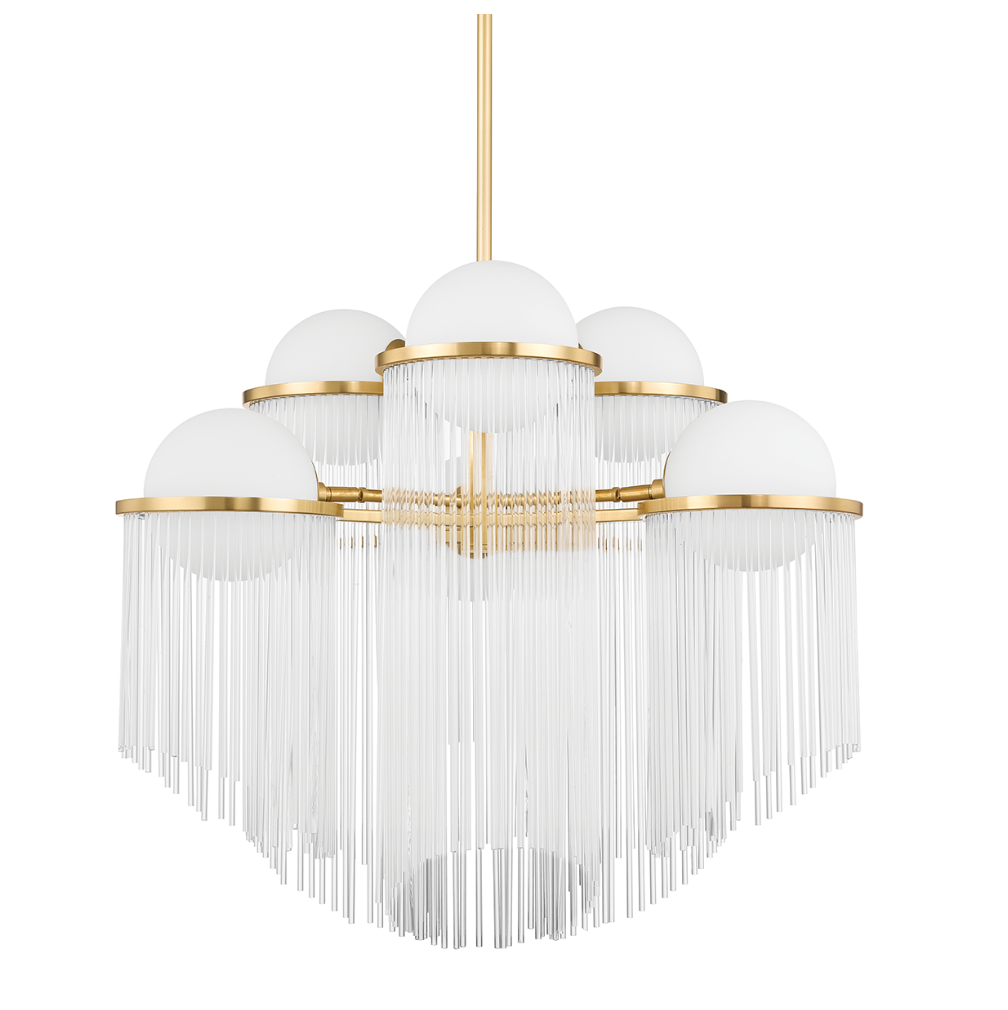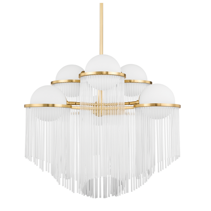 The Celestial Chandelier Medium combines aged brass, clear glass rods, and opal matte globes, offering a refined and timeless design. With six lamps, this chandelier provides ample light while maintaining a chic and minimalist aesthetic perfect for various spaces.