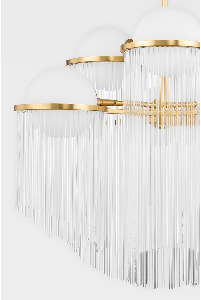 With its old Hollywood aesthetic, the Celestial Chandelier Medium pays homage to the stars, creating an elegant and dramatic lighting piece for any space. Angled glass rods cascade downward from aged brass rings that encircle opal matte globes, filling the room with soft, ambient light. The glowing globes illuminate the floating rods beneath, casting a mesmerizing effect. This stunning design is perfect for bringing a touch of glamour and sophistication to your living room, dining area, or foyer.