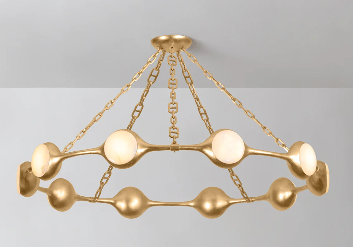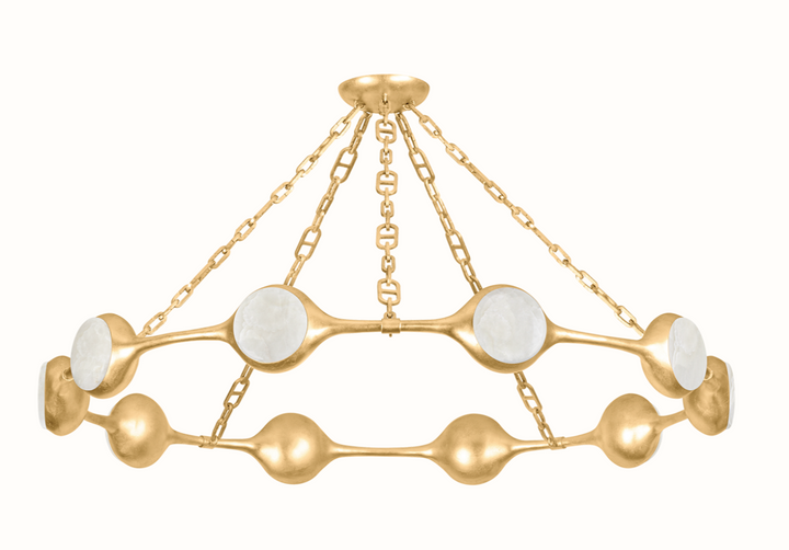 Inspired by Noz Nozawa’s stackable rings, the Riviere Chandelier features a classic silhouette with striking details that give it a modern, jewelry-inspired look. Organic, pod-shaped heads encase ice onyx discs within a bezel setting, reminiscent of the way gemstones are set into rings. Finished in Vintage Gold Leaf, the distinctive chain suspending the chandelier adds an additional elegant touch, making it a statement piece in any space. Available in both 8 and 10-light versions, Riviere brings a refined, contemporary look to your home or business, offering a beautiful balance of style and energy efficiency with integrated LED lighting.